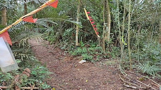 義確山登山口,位於一排緊靠的電線桿過後,右上水泥路往荒廢農地,入樹林後路況轉清晰。H330m |