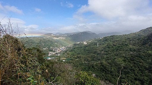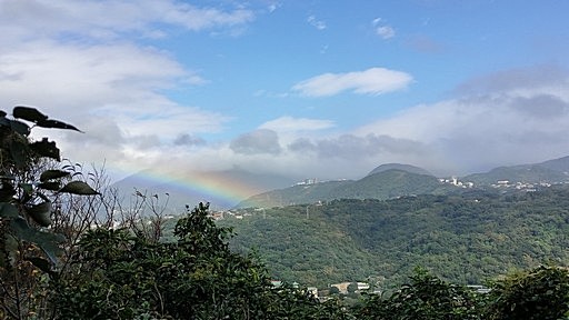 山頭觀景點,有張木椅,展望頗佳,可眺望大崙尾山、尾崙山、七星山。出現一道彩虹跨越莊子頂山。休息賞景。H205m |