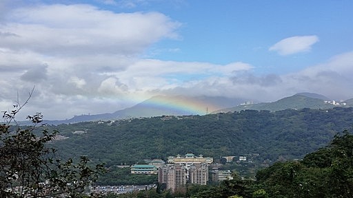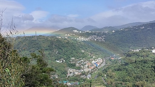 文間山,184m,土地調查局圖根點。樹林間展望不佳。往至善路方向有條支稜山路,舊休息區已荒廢,路底可眺望陽明山,出現一道彩虹。H184m |