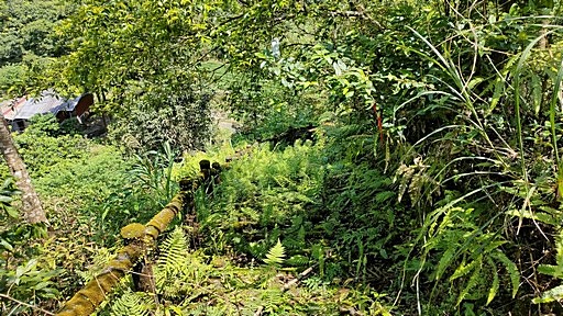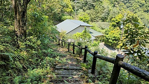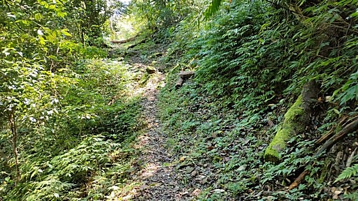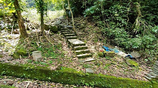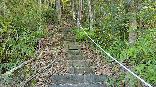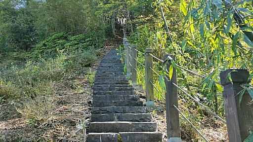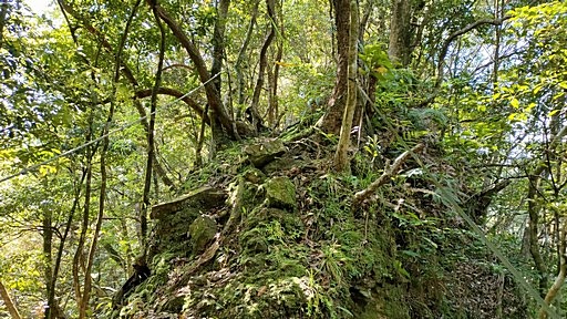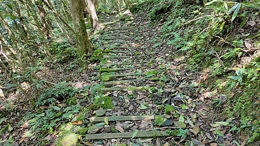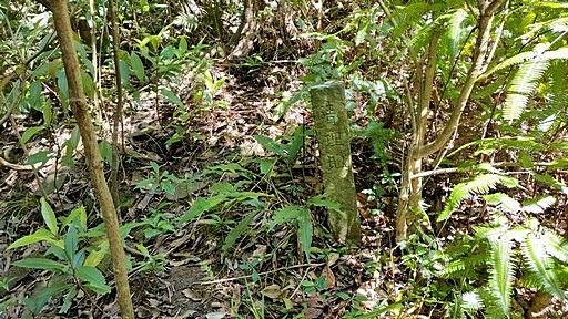 清理地石柱,剛好位於步道左轉下稜處。下稜後轉為一路腰繞。後段步道轉為石板步道,連欄杆都出現了。離步道入口幾十公尺處居然雜草叢生,步道顯然冷門。H613m |