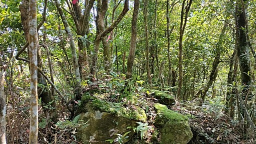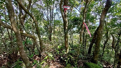 硿仔崙,601m,無基石。從山下眺望雖然山勢出眾,但山頂卻毫不起眼,有些青苔石塊,樹林間無展望。H605m |