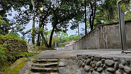 齋明寺古道上口,位於齋明寺圍牆外,左往齋明寺大門,右側封閉車道往萃靈塔、惜字亭,小門可入,取右探看再回。這個園區亦屬齋明寺。H176m |