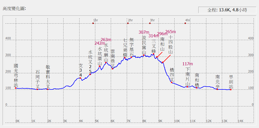 三叉峰,288m,水準點NO.1基石。樹林間無展望。叉路,左往南和山,右往竹16登山口100分。H314m |