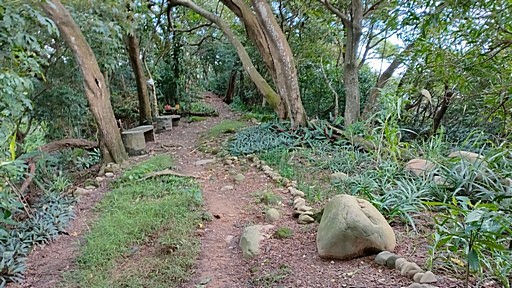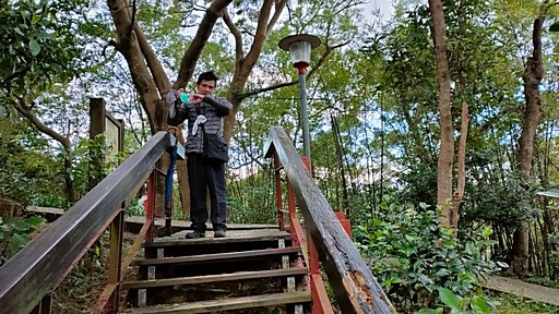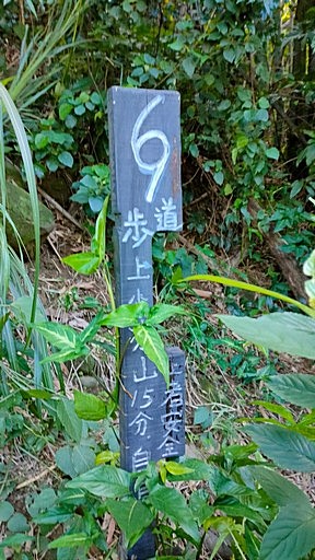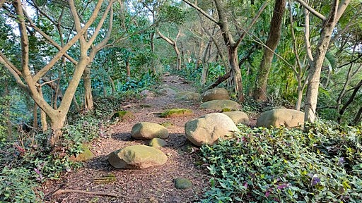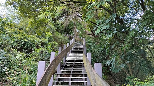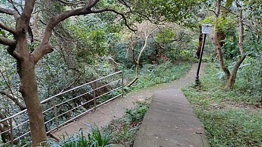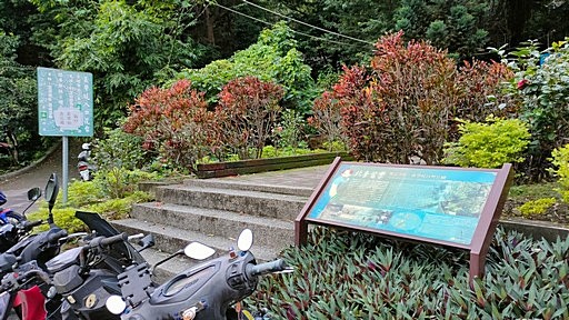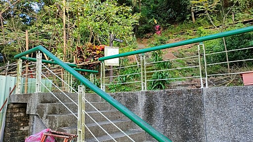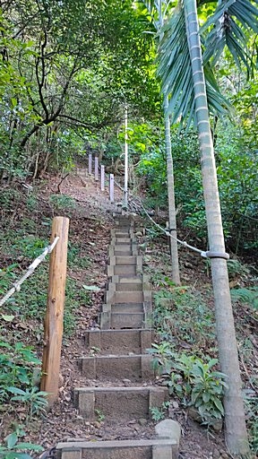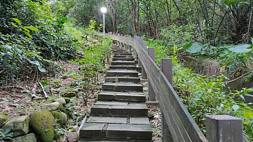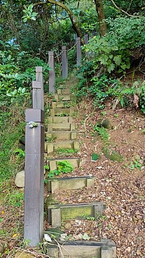 義學坑步道入口,位於明志路二段254巷底,從義學坑自然公園花台進入一路往上的石階步道。後段上稜,漸漸出現陡上木棧道。H18m |