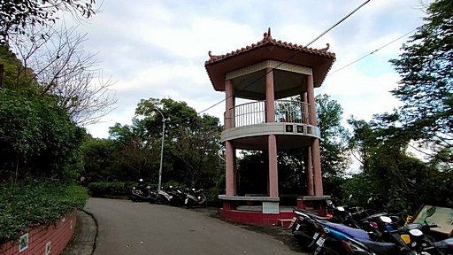 瓊仔湖福德宮,旁邊有座兩層樓高的清風亭(觀景亭),展望極佳。左為車道往黎明路,直下有步道往明志路(136巷),右側穿越福德宮有封閉車道往義學坑自然公園。取左。H126m |