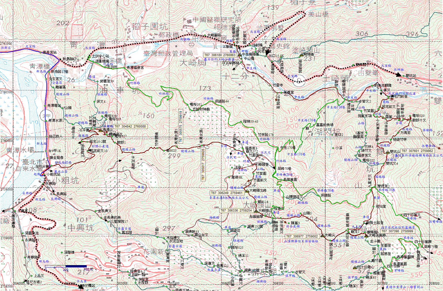 中山橋,過橋即接北宜路,取左側舊路往中生橋頭崙。H59m |