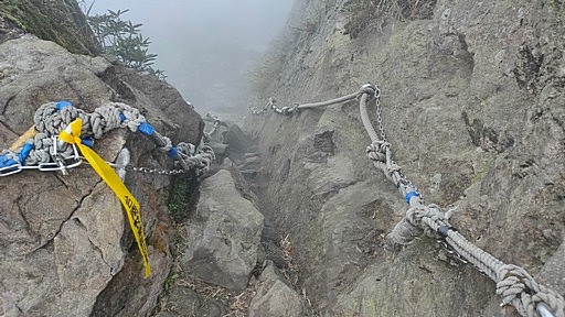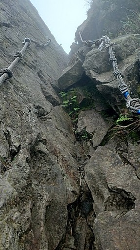 13:21 山路陡峭,沿途攀繩而下。