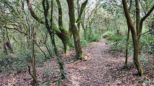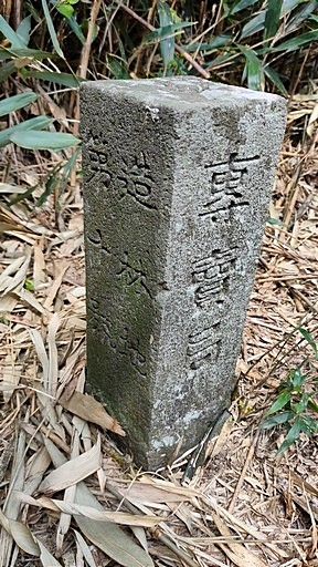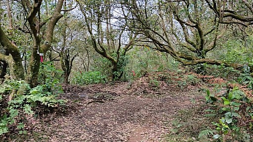 界柱叉路,接上位於稜線上的瑪礁古道,左往擎天崗,右往新圳頭山、清風亭,路口的樹旁有陽明山農場水泥柱。取左。H567m |
