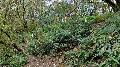 天寶聖道宮叉路,左下山路往天寶聖道宮、冷水坑站,直行往七股山,直行。末段出樹林轉為箭竹山路。H855m |