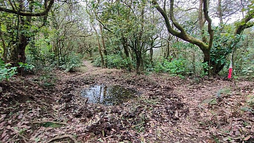 山頭下方叉路,十字路口,無標示,左下往內寮古道,右上山頭往內雙溪古道,續前行。稍後開始出現牛池。H755m |