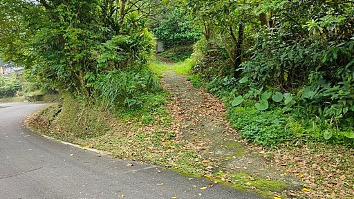 民宅25號,直行為民宅車道往下,右側角落發現登山路條,原來有續往下的最後一段古道。H84m |