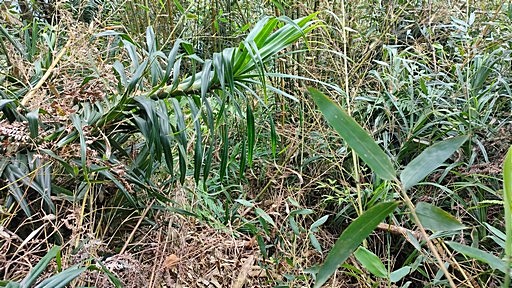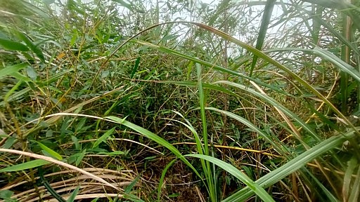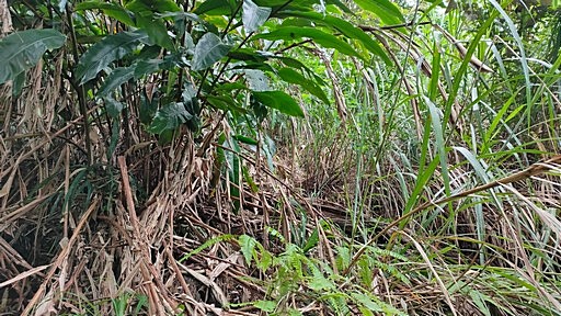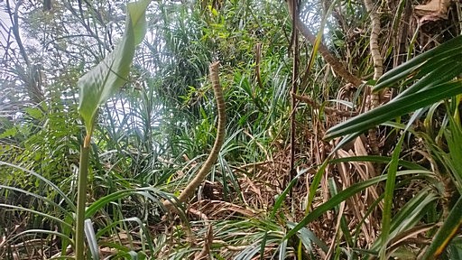 稜線山林投叢,山路往右一路陡下。回稜後路況轉佳。中途有小段山林投加上桂竹盤據路段,開路不易。H235m |