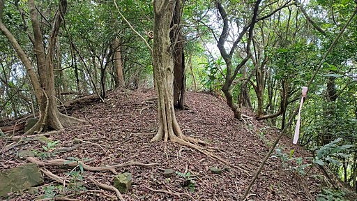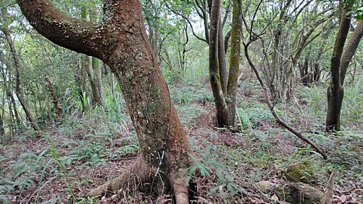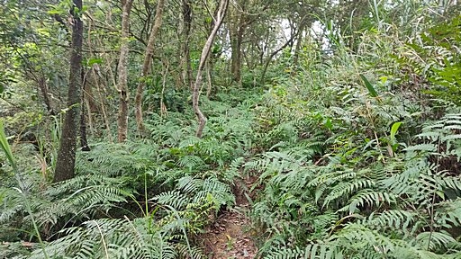 上稜,發現稜線上無明顯路徑,稍退回發現上稜前有腰繞緩上的山路慢慢才上稜。正路上稜後路況轉趨明朗。登頂前有疑似叉路,但或許是寬稜地帶新舊路之不同。H221m |