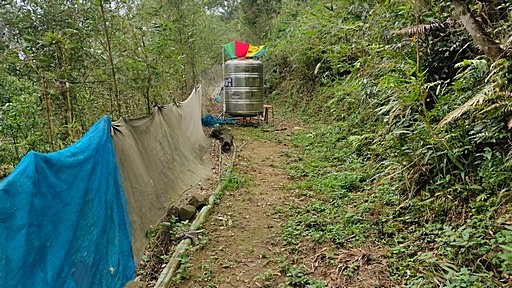 農路叉路,主線農路前方有一水塔,取右往上之較小竹林農路。中途誤取左提早上往稜線,上行一段後發現偏離航跡,且有農地外圍圍籬,頗高。退回竹林農路,續腰繞緩上。H199m |