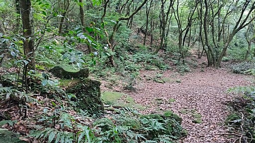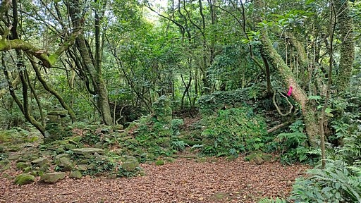 廢棄石厝,左側山路可通先前的菁山路十字路口,登山指標往竹篙山西南峰(菁礐山)。續前行。H521m |