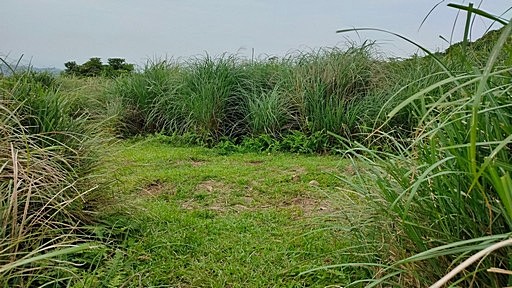 狹長草地叉路,左下山路應可回內寮古道,取右上,往竹篙山。芒草山路幸好有砍過,路徑清晰,一路略蜿蜒往上。H763m |