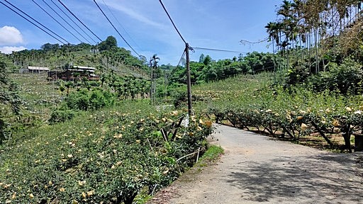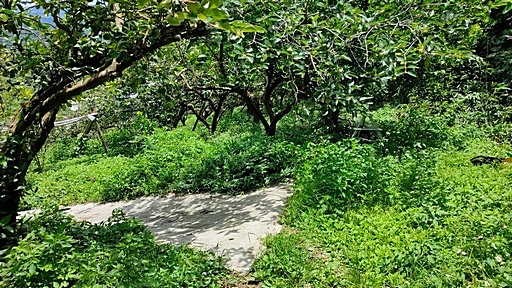 舊路叉路,舊路於民宅附近路左梨園小徑回往稜線,因窒礙難行,已改道繞過,續行產道緩下。產道叉路皆取主線往下。H553m |