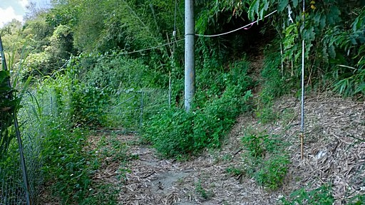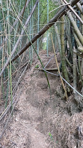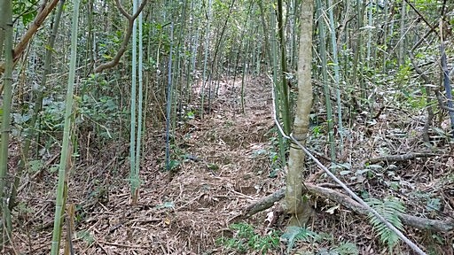 鐵皮農寮,循泥土農路而行,注意上切點,進入稜線竹林。H590m |