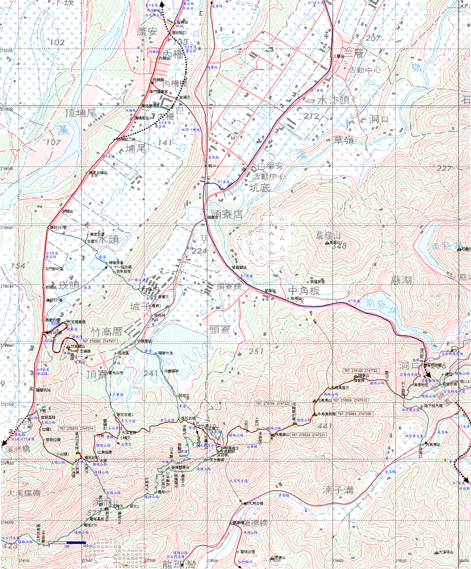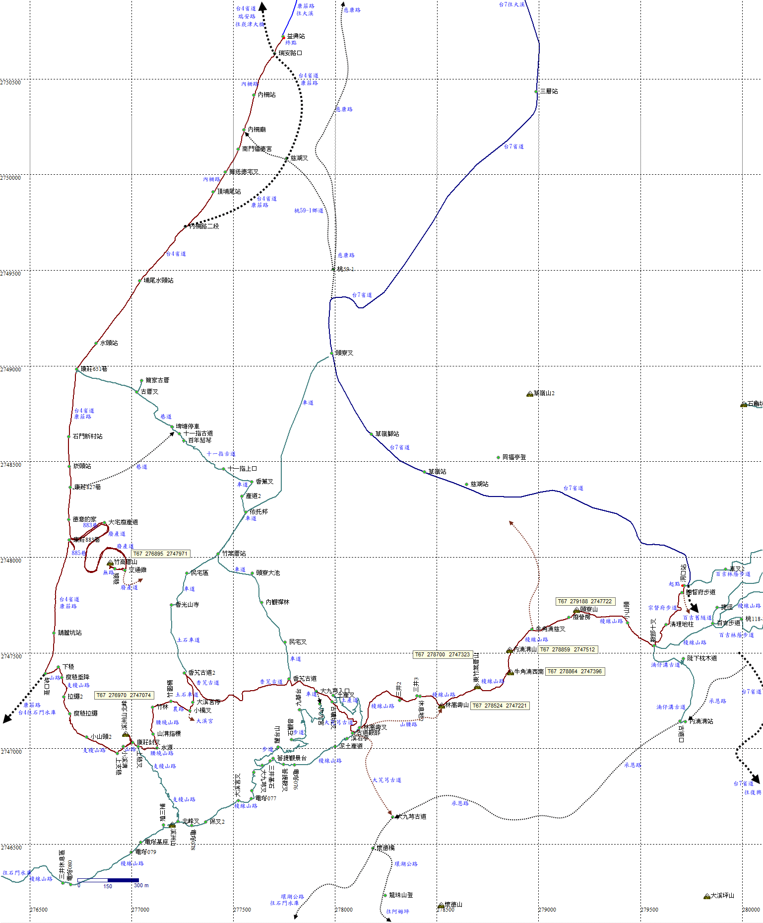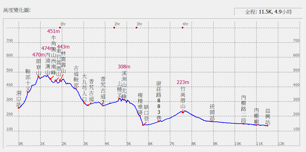 回到康莊路三段883巷口,續行康莊路往內柵。沿途至少有三個十一指古道叉路。H162m |