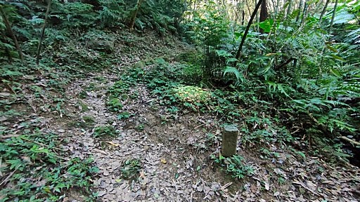 慈湖停車場叉路,右下山路往慈湖停車場,日據時代地形圖上標示此處為牛角湳山,只找到一根小水泥柱。H476m |
