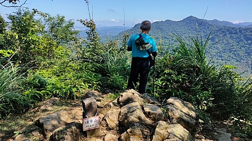 林嵩壽山,460m,三井基石。稜線步道從旁經過,基石很顯眼,但無標示牌。樹林間無展望。這種三井基石另一面都刻林嵩壽,因以為山名。山頂循另一支稜可循山腰路往大艽芎古道。H443m |