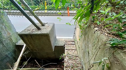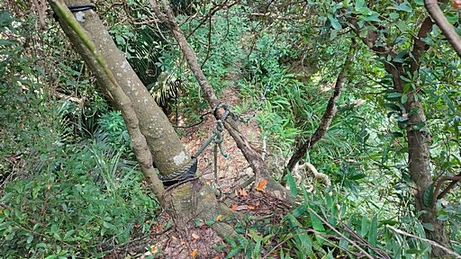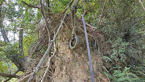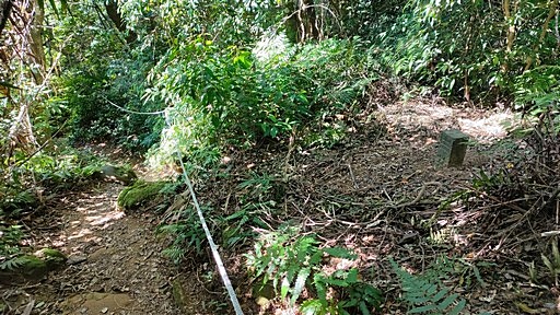繩索封路,大溪分隊設有已崩塌路線警告牌。左下發現山路往康莊路,先循稜往前探看,發現有大片藤蔓阻路,無路跡,退回。H318m |
