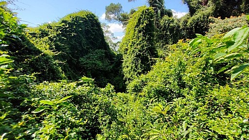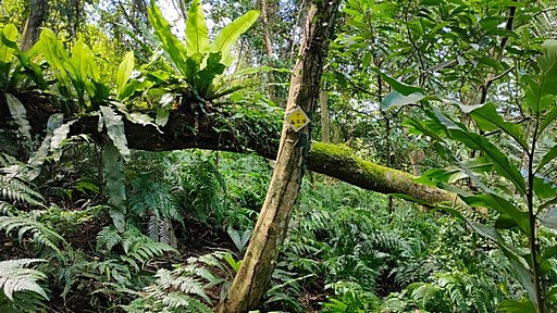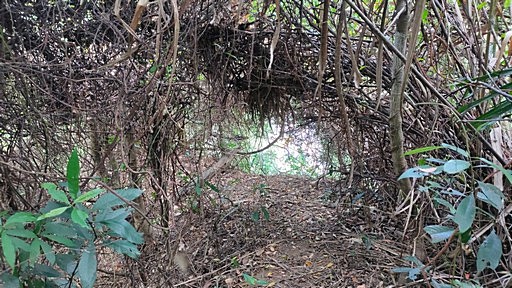 回到繩索封路處下方約十公尺的康莊路線,回程繞著倒塌藤蔓外圍走,比較輕鬆,但無路徑。循康莊路線下山。 |
