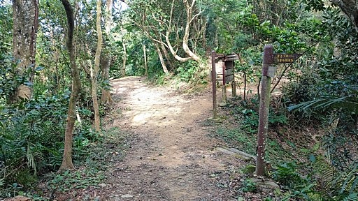 慈湖停車場叉路,左下山路往慈湖停車場,續行稜線步道往頭寮山。日據時代地形圖上標示此處為牛角湳山,只找到一根小水泥柱。休息。H479m |