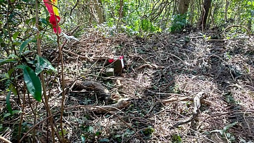 上支稜,右轉循稜緩上,繞過一些擋路的竹叢。接近山頂開始出現大片藤蔓阻路,藤蔓右下方終於見到此山的第一個登山路條,但似乎稜左繞過藤蔓比較好走,取左。H201m |
