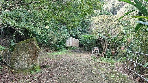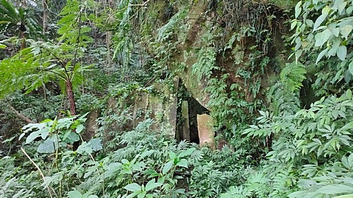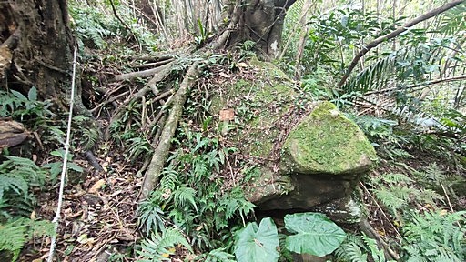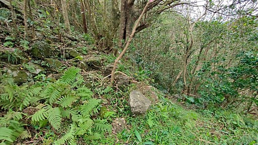 岩壁石屋,位於路左二十公尺,石屋格局小,且依偎在傾斜的岩壁下,很有壓迫感,可能只是工寮。H251m |