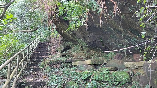 岩壁下石椅,稍後步道轉為古道,有些古老的石階,路況還算不錯。H327m |