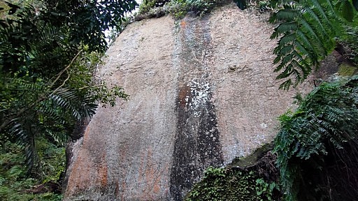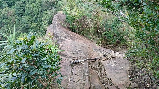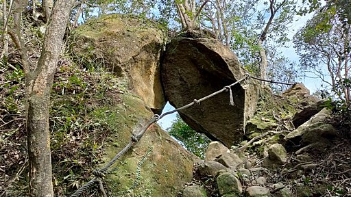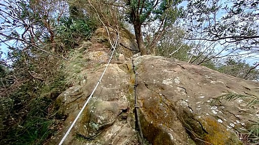 巨岩壁,高約20公尺,筆直樹立於路旁,相當壯觀,這裡就是俗稱的土匪洞,但岩壁下是一處空地,其實並沒有洞,附近只見一些小小的岩穴,勉強可容幾人躲雨而已。當年陳秋菊據此天險以抗日,因陳秋菊騎白馬,人稱白馬將軍,土匪洞又稱白馬將軍洞。H371m |