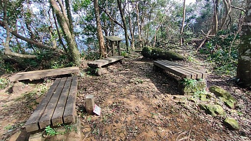 展望峰叉路,接上烏塗溪步道,左往石碇國小,右往烏塗窟,附近的步道椅上休息整裝。H92m |
