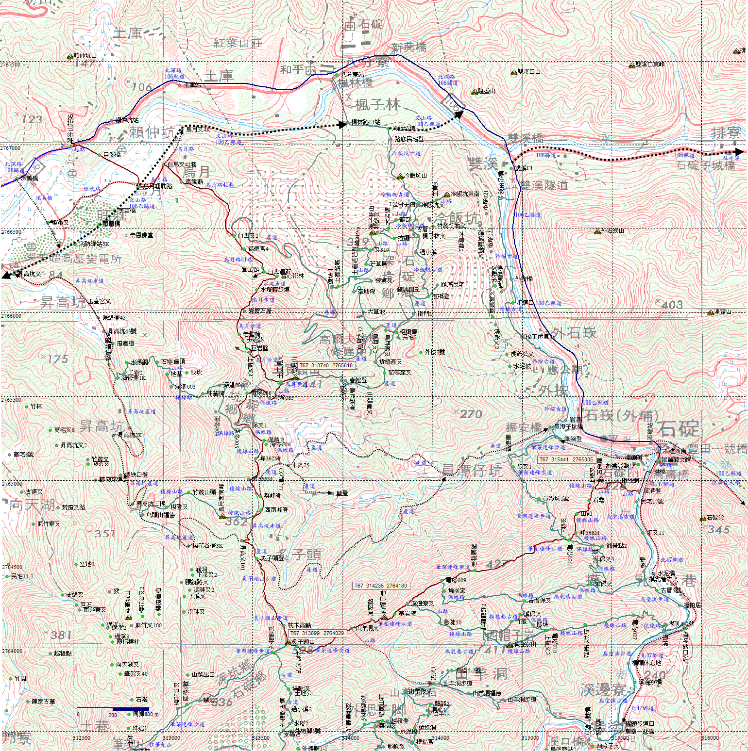 北宜高鐵絲網,稍後繼續一路往下。山谷多竹林。末段溯小溪溝而下。H166m |