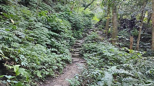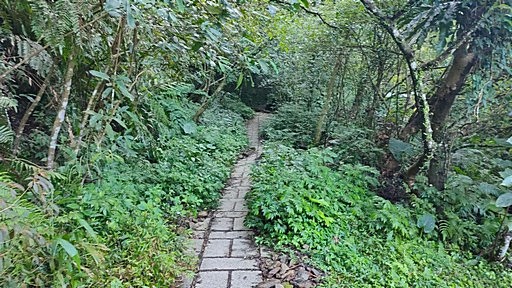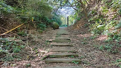 二格山登山口,位於彎道,石階步道無指標,不久轉為古道階梯往上。H392m |