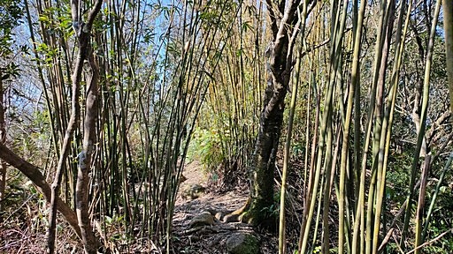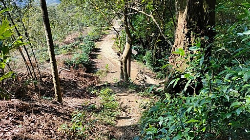 續行,稍後山路轉陡下。原本腰繞下竹園的山路已改線,大致循稜而下,路況較佳。 |