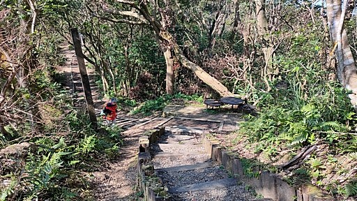 登頂前叉路,左下步道往優人神鼓,直行隨即登頂。 |