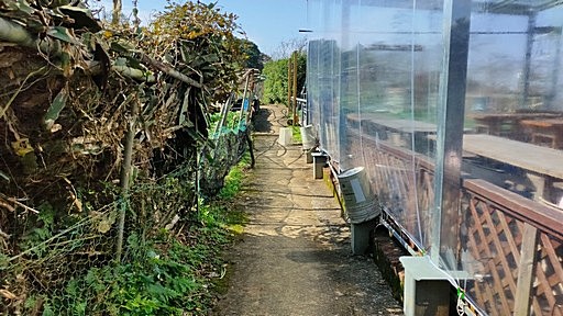 德高嶺福德祠後方木門,續行可往大香山、員潭子坑山。木門如屏風可繞過。水泥步道往大香山。H241m |