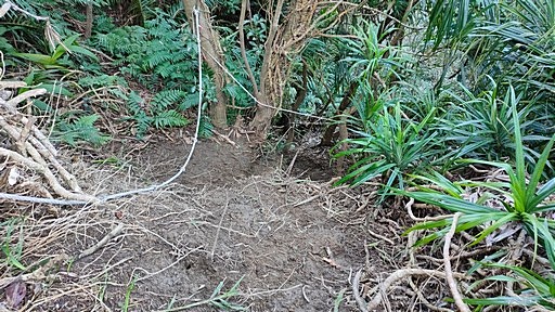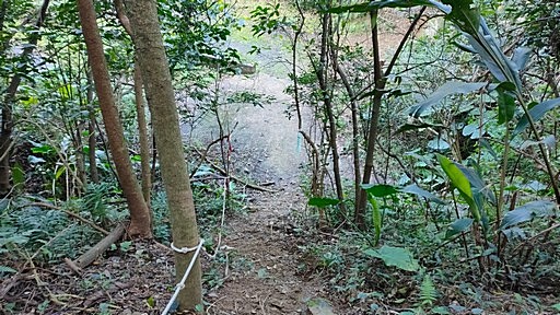 廢棄蓄水池,續行是明顯的壕溝山路。不久是急陡的山林投垂降坡,有山林投與繩索可拉。H183m |
