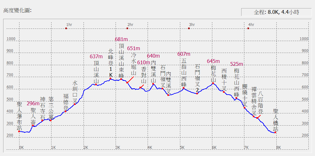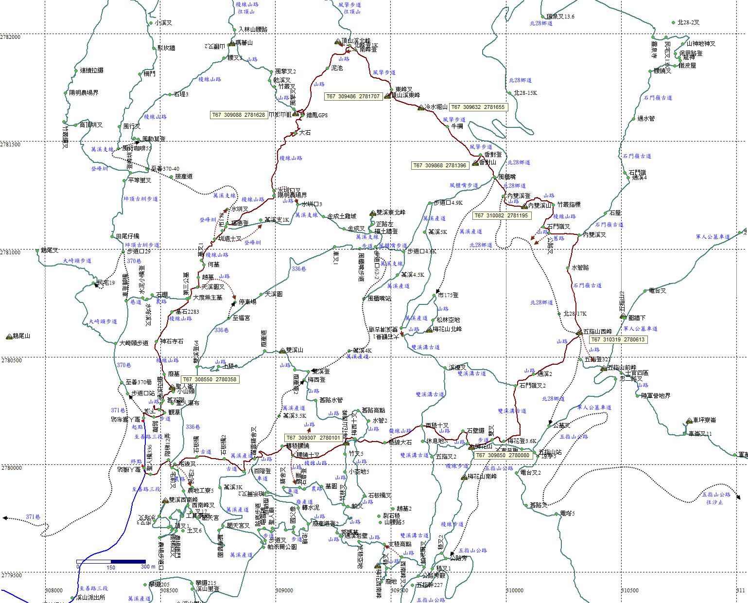 續行,從都市計劃處基石處循山路下往雙溪溝古道、梅花山西峰。 |