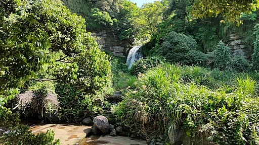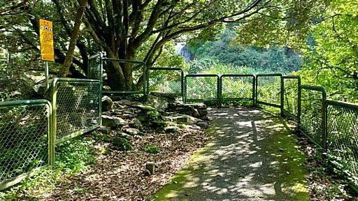 路底,鐵欄封閉,可隔溪遠眺聖人瀑布。聖人崙的登山口在剛才路障之前,沒注意到,在此直接翻過鐵欄,下溪,發現溪水豐沛,聖人瀑布不易親近,往上游眺望,可見聖人崙過溪點附近有登山路條,但直接溯溪亦不易。回到樹林間找聖人崙的下溪點,樹林間缺乏路條導引,來回試探。H244m |