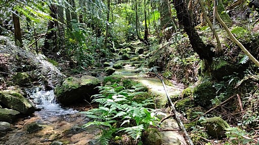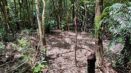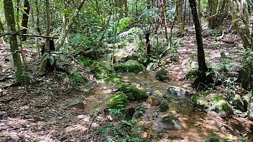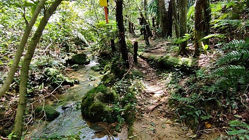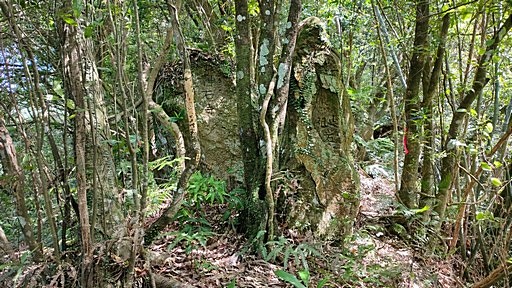 五指山西峰(五指山鞍部),612m,瑪鋉溪水源保護區界06。基石位於五指山公路旁。公路對面是下往雙溪溝古道的登山口。山路循溪谷往下,幾度過小小溪流,路況不錯。H607m |