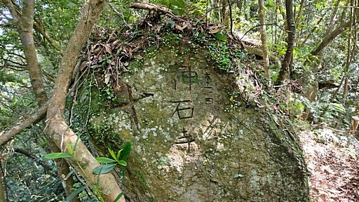 路中大石,上刻神石寺、山祖岩。最後抵稜線邊竹園,穿越即接上第三公墓步道。H337m |