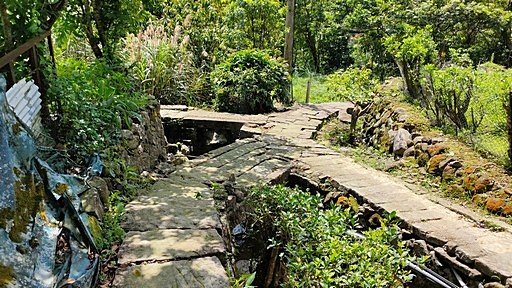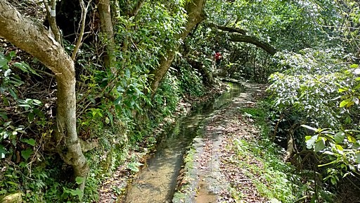 民宅舊道叉路,接上石門嶺保甲路,左往溪底靈泉禪寺,右往五指山鞍部,取右。古道循溪緩上,路況佳。H549m |