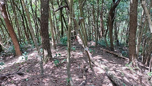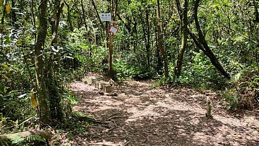 頂山溪山東峰叉路,位於步道高點,右側牛路往頂山溪山東峰,不見登山路條。選擇較好走的偏左牛路,靠近山頂才往右登頂,此處終於出現路條。H679m |