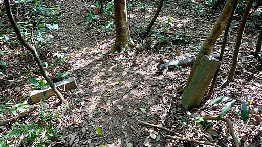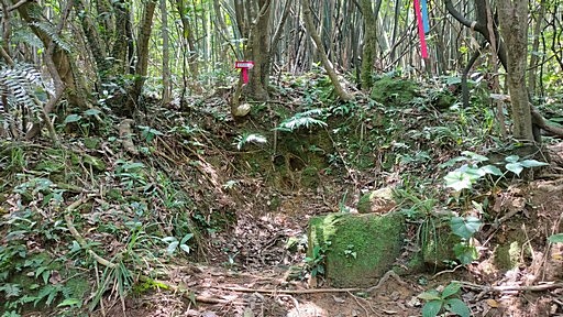 瑪鎖山東北峰叉路,位於稜線下方,右上稜線山路往瑪鎖山東北峰,稜線上有兩根灣潭斷層基石,探看一下再退回續行古道。稍後路旁有涵管堆。H176m |