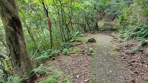 山路叉路,左側寬大的山路有登山路條,或許可接十三層保甲路,續前行。末段再度轉為石階步道。H269m |