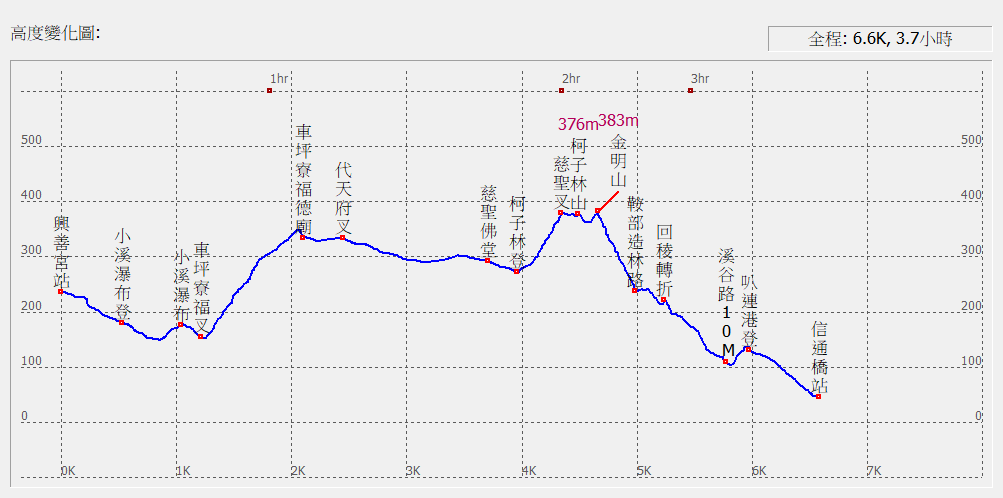 金明山(金面山、柯子林山東峰),391m,無基石。山頂展望極佳,可眺望新山、五指山、白石湖山。續往下有另一個觀景點,可眺望老爺山莊。H383m |