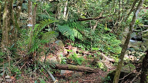小溪瀑布登山口,位於彎道,登山指標往小溪瀑布約20分。進入平緩山路,路況佳,大致上緩下往溪邊。H179m |
