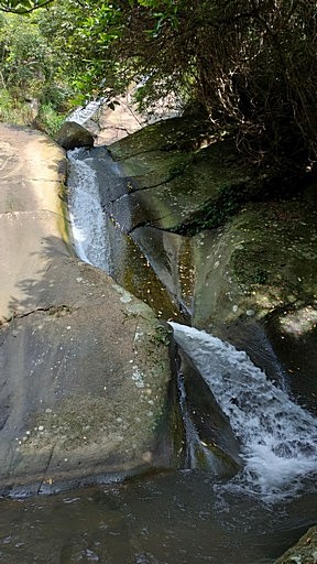 溪邊大石區,大石落差頗大,溯溪有點難度,山路往左攀繩高繞往上游,路況仍佳。H155m |